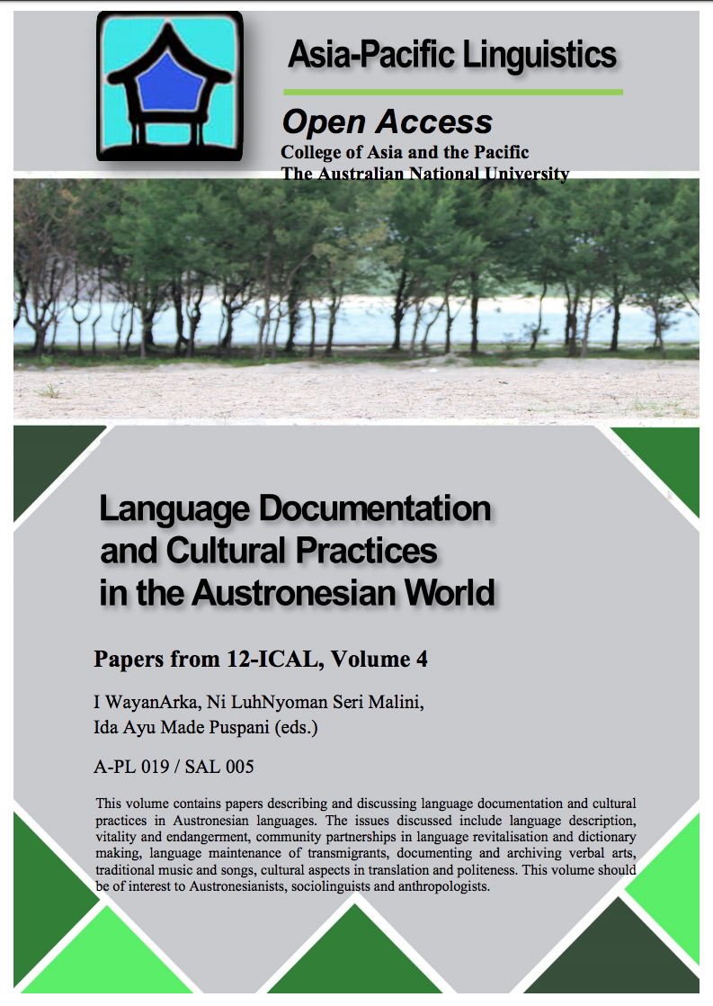Arka, Nyoman, Malini & Puspani (ed) (2015) Language documentation and cultural practices in the Austronesian World: Papers from 12-ICAL, volume 4, ISBN 9781922185204, A-PL series 19 – available from ANU Open Access Repository website