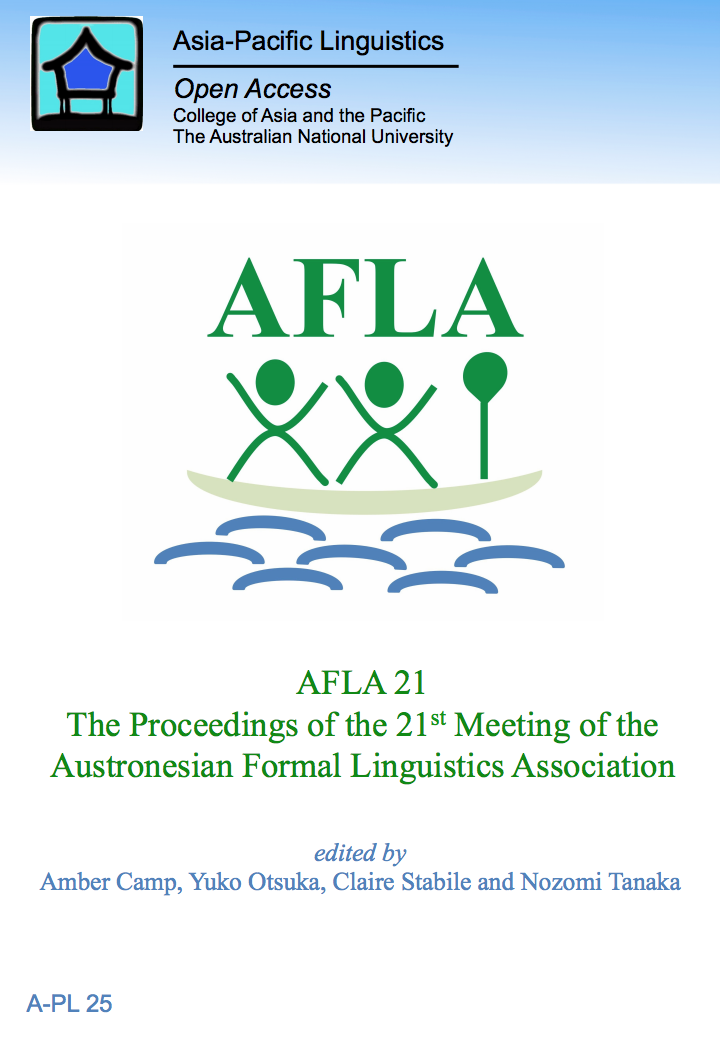 Camp, Otsuka, Stabile & Tanaka (ed) (2015) AFLA 21: The proceedings of the 21st meeting of the Austronesian Formal Linguistics Association, ISBN 9781922185280, A-PL series 25 – available via the ANU Open Access Repository website
