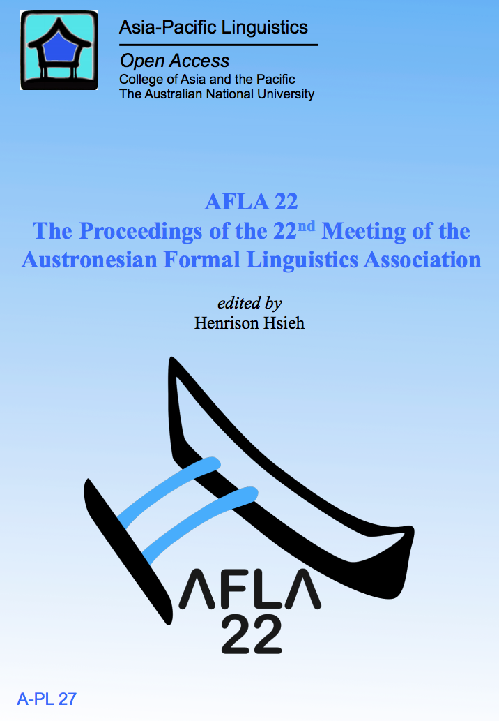 Hsieh (ed) (2016) AFLA 22: the Proceedings of the 22nd meeting of the Austronesian Formal Linguistics Association, ISBN 9781922185303, A-PL series 27 – available via the ANU Open Access Repository website