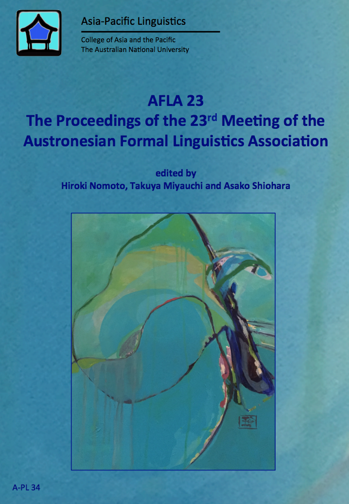 Nomoto, Miyauchi, & Shiohara (ed) (2016) AFLA 23: The Proceedings of the 23rd Meeting of the Austronesian Formal Linguistics Association, ISBN 9781922185365, A-PL series 34 – available via the ANU Open Access Repository website
